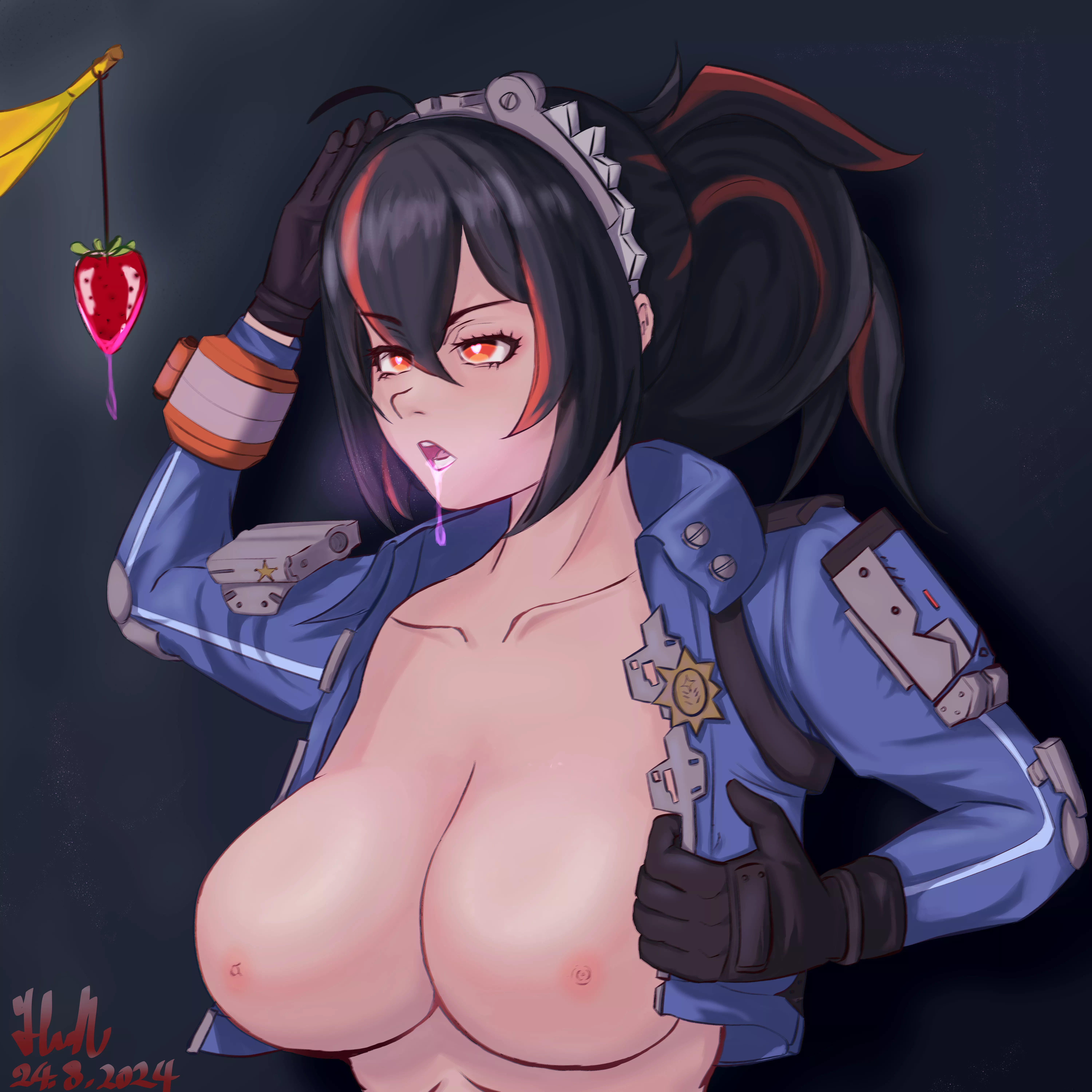 "it's illegal to have such a delicious strawberry around here! so you gotta let me have it!" (Zhu Yuan from ZZZ, drawn by HvN)