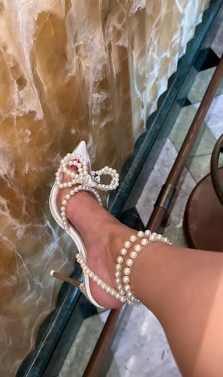 "Elegance meets sophistication with these stunning pearl heels. 👠✨"