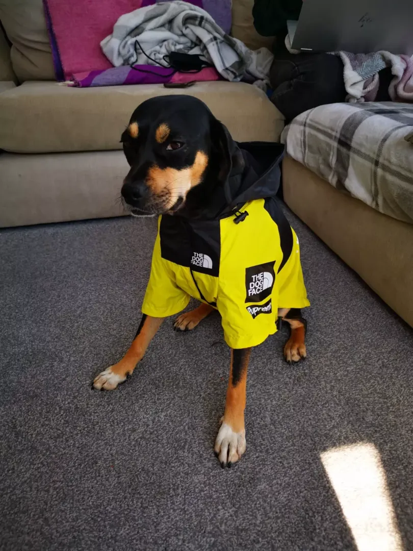 "I got my puppy a coat to protect her from the rain. She is not impressed."